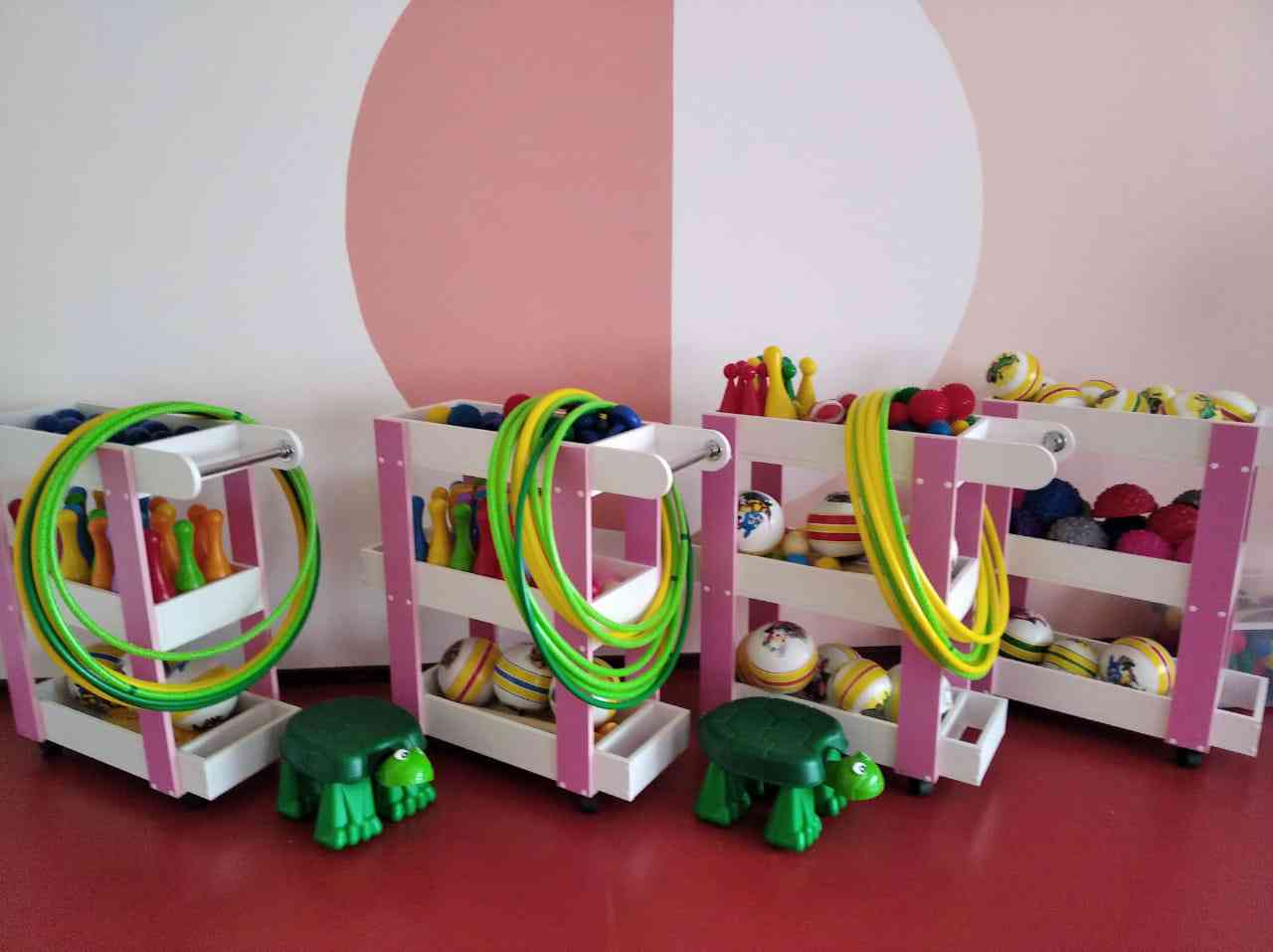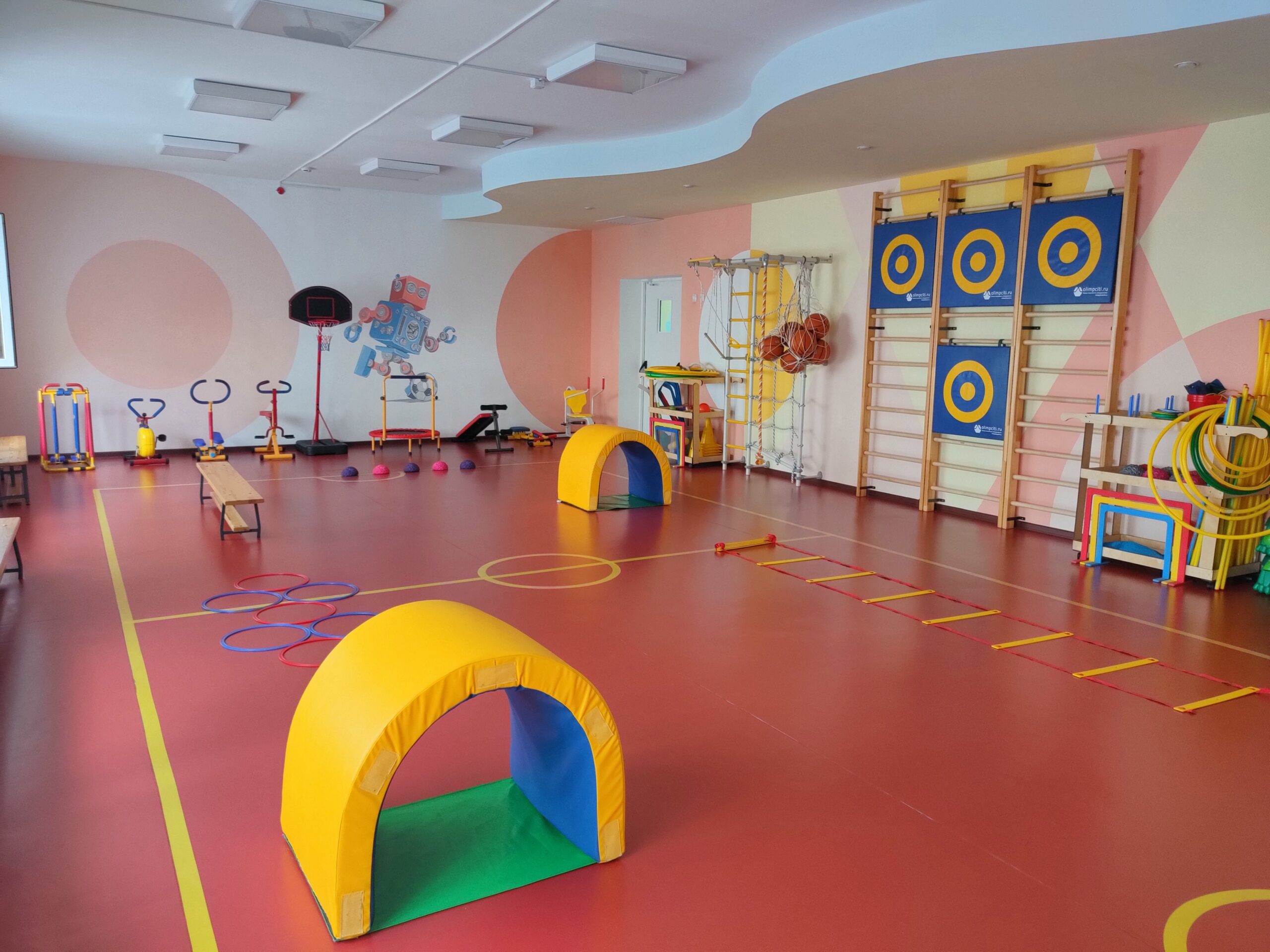 Оснащение физкультурного зала обеспечивает реализацию потребностей детей в двигательной активности, формирование основных двигательных умений и навыков. В физкультурном зале проводятся утренняя гимнастика, организованная образовательная деятельность, физкультурные досуги, праздники и развлечения. Оснащен современным оборудованием: тренажеры, маты гимнастические, обручи и мячи разных размеров, скакалки, гантели, шведская стенка, канат, гимнастические скамейки, спортинвентарь, массажные дорожки, сенсорные мячи, спортивный уголок.