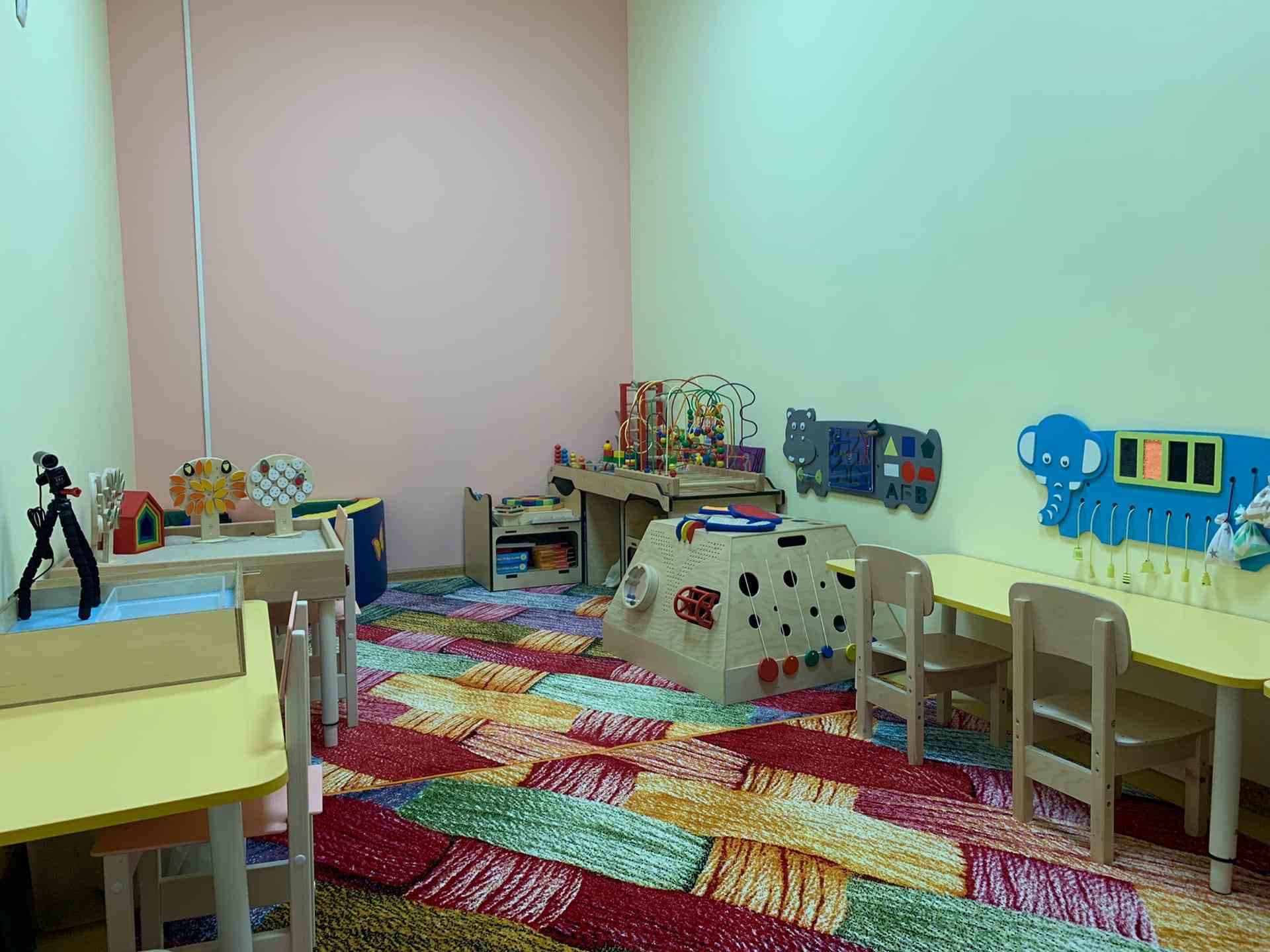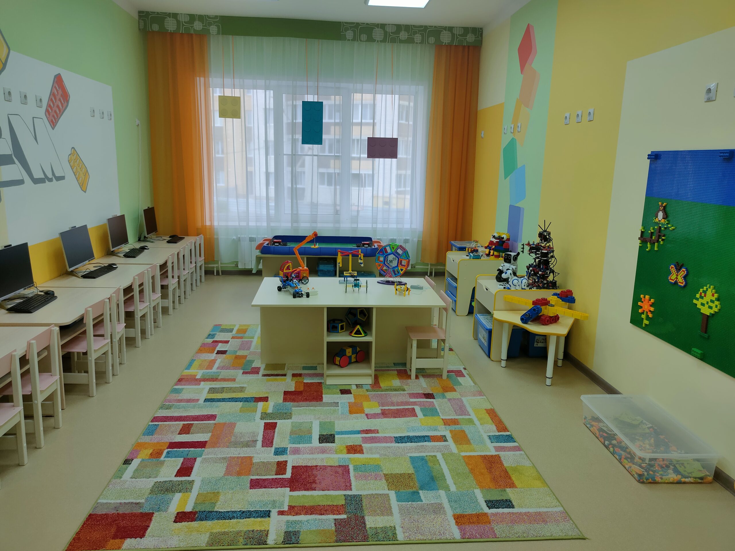 Оснащена наборами Lego-duplo, Lego — Education, My robot time, роботреки, LegoWeDo, программируемых роботов Bee-bot и робо-мыши, комплектами «Мобильная робототехника» на базе конструктора Robo KIDS, конструкторы серии «Полидрон», Huna, «Робофутбол», «Болтли», «Matatalab», интерактивным столом Project touch для развития пространственного и логического мышления.
