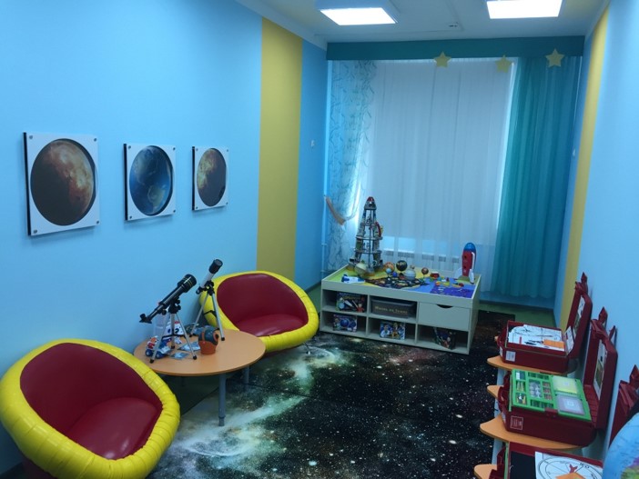 Оборудована астропланетарием Levenhuk LabZZ, интерактивным глобусом «Звездное небо», интерактивной панелью «Звездный мир» — виртуальной энциклопедиями, которые позволяют детям путешествовать по миру и вселенной, не выходя из комнаты.