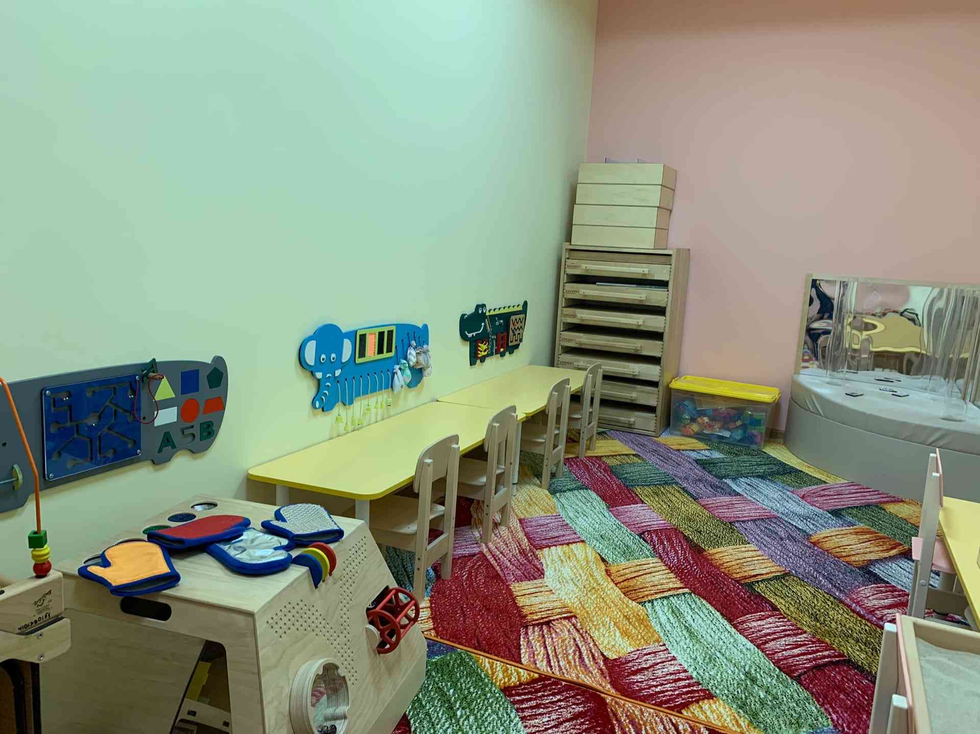 Сенсорная комната предназначена для создания положительного эмоционального фона и преодолении нарушений эмоционально-волевой сферы. Сенсорные комнаты оборудованы интерактивной песочницей «Полянка», светозвуковым столом для занятий с песком; сухим бассейном; набором развивающих настенных панелей (звук, сенсорика); интерактивной воздушно-пузырьковой трубой с пультом управления; панно с фитоптическими нитями.