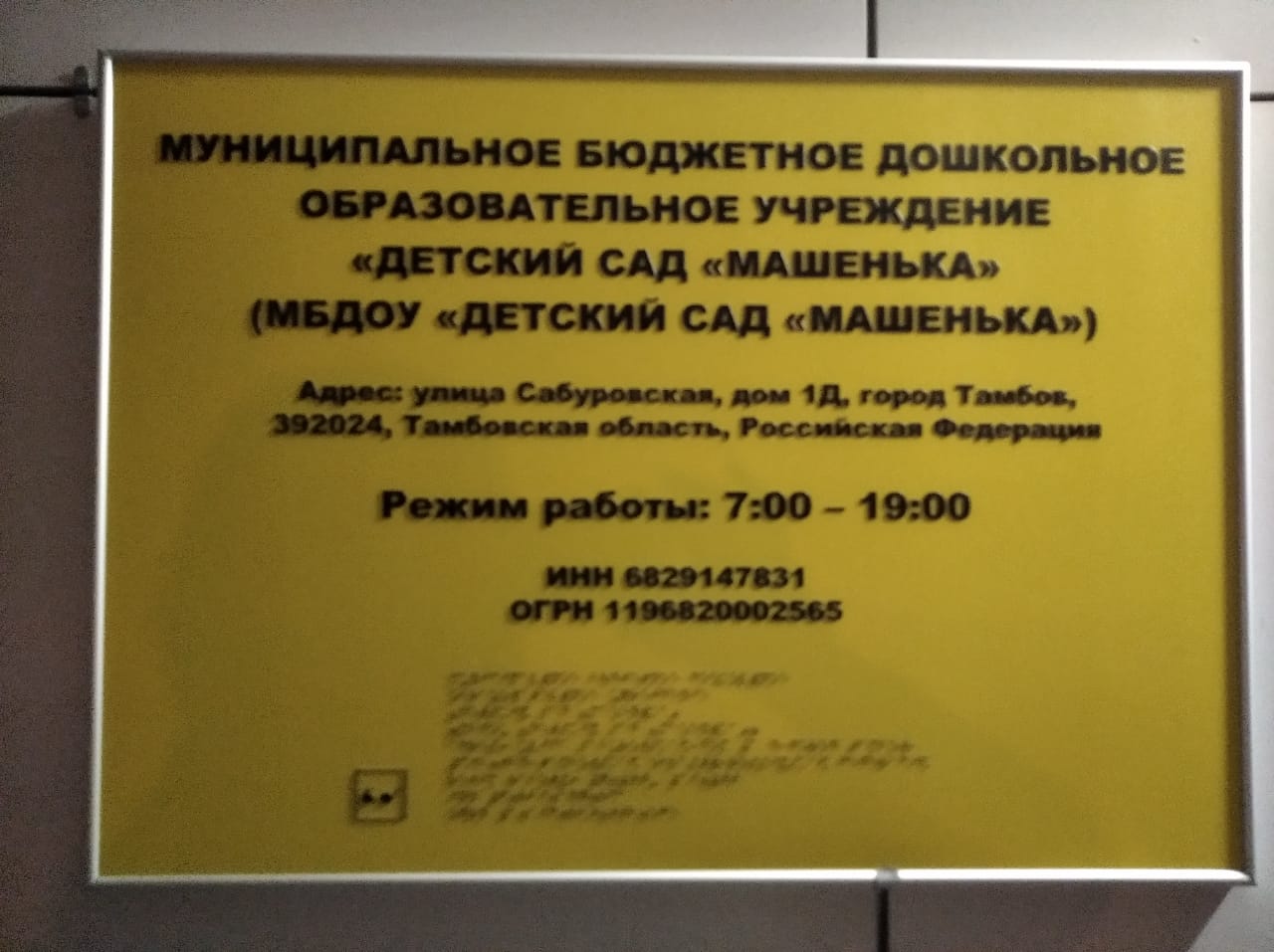 · вывеску с наименованием учреждения и графиком работы, таблички-указатели и план эвакуации, выполненные шрифтом Брайеля на контрастном фоне.